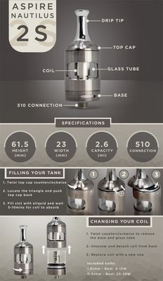 Aspire size yepyeni, aynı kıvrımlı, Nautilus 2S'yi getiriyor. 2.6 ml'lik yeni Nautilus 2S tankı ve TPD için 2 ml'lik bir versiyon. Nautilus 2 tank serisindeki en son ürün, doğrudan akciğer buharlamasına ve 0,4ohm BVC'ye ve ağızdan akciğer buharına kadar 1.8ohm BVC'ye sahip şık ve kıvrımlı bir tasarıma sahiptir. Silikonlu kendinden contalı üst dolgulu çocuklara dayanıklı tasarım, eşyaları temiz tutar ve bobinler diğer Nautilus bobinleriyle değiştirilebilir olduğundan, çekme / buhar tercihinizi kişiselleştirmenize olanak tanır.