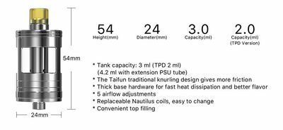 Nautilus GT, Taifun üst düzey RTA'lar ve Aspire serilerinin yapımcıları arasında bir işbirliği projesidir. Smokerstore tarafından Almanya'da tasarlanan ve Aspire tarafından Çin'de üretilen bu yeni Nautilus tankı, en yüksek standart MTL değiştirilebilir tankı olacak. Olağanüstü MTL lezzet ve vape deneyimi için bugüne kadarki en popüler atomizer. Nautilus GT, 0.7ohm ağ bobini kullanılarak doğrudan DL vape için de kullanılabilir. Nautilus GT, büyük doldurma bağlantı noktalarını ortaya çıkarmak için üst kapağın hafif bir turuyla doldurulabilir. Hava akışı AFC halkası ile kolayca ayarlanabilir. Bu tank, modunuzda harika görünecek, mükemmel bir deneyim sunacak ve zaman testini yapacak. Tamamen 'üst seviye' atomizer.