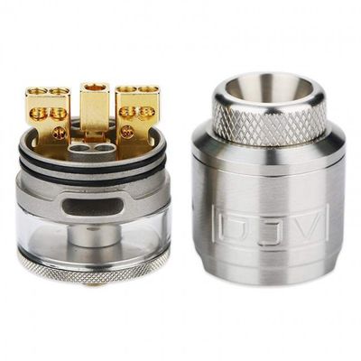 DEJAVU 25mm RDTA zarif bir şekilde tasarlanmış olup benzersiz iki direkli post tasarımı başına üçlü terminalin, iki tip hava akış sisteminin ve uygun merkezi doldurma yönteminin entegrasyonu ile optimum lezzet rekreasyonu ve buhar oluşturma başarısı ile oluşturulmuştur. DEJAVU RDTA'nın yapısı, dayanıklı paslanmaz çelik malzemelerle ve CNC ile hassas bir şekilde öğütülmüş, taban çapı 25mm'dir. Paket içeriğinde takılı ve yedek olan ULTEM ve Paslanmaz Çelik 528 geniş çaplı damla ucu, performans ve göstergede ek çok yönlülük sağlar. Altın kaplama yapı güvertesi kullanıcı dostu olup, iki direğin tasarımında her gönderide üç terminal ile birlikte karmaşık konfigürasyonların bir bolluğunu barındırmaktadır. Hava akımı yapıya iki kanaldan girer: sabit bir çift tabanlı hava akımı ve tamamen ayarlanabilir bir çift yarıklı yan hava akışı sağlar.