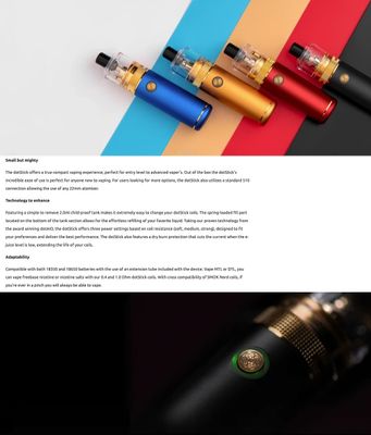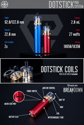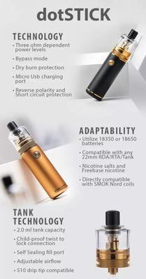 Dotmod DotStick Starter Kit, Tek bir yüksek amper pil, 3 kademeli güç çıkışı ve dotStick Tank ile kuru yanma koruması sunan Dotmod dotStick Başlangıç Kitine göz atın. Dayanıklı alüminyum alaşımdan üretilen dotStick'in şasisi, hafif düşmelere ve düşmelere karşı dayanıklıdır. Tek bir 18350 veya 18650 pil barındıran pil yuvasına dişli alt kapaktan erişilebilir ve pilin ikinci boyutlandırması kullanılırken uzatılması gerekir. Üç katmanlı çıkış yoluyla güç sağlayan Dotmod dotStick, takılan bobinin direncine bağlı olarak yumuşak, orta veya sert bir çıktı sunar. Üstte 510 bağlantıyla bağlanan 22 mm'lik bir tank, diğer tankların veya yeniden yapılandırılabilir atomizörlerin kullanılmasına izin veriyor. DotStick Tank içinde 2 mL'ye kadar eJuice tutan kapasite, tankın çift oluklu hava akışı bağlantısından alttan yaylı doldurma için bastırarak doldurma portundan çıkarılmasıyla yeniden doldurulabilir, bu da çirkin bir şekilde dağınık sızıntıları önler.