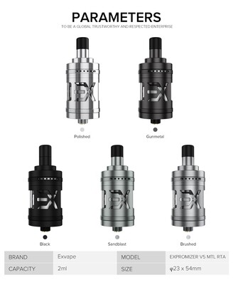 Exvape Expromizer V5 MTL RTA, Almanya'da tasarlanan MTL RTA'nın beşinci neslidir. Expromizer V5, 23 mm çaplı tek bobin güvertesini korur. Üst doldurma kapağı ve üst hava akışı ile Expromizer V5 MTL RTA hızlı ve kolay bir şekilde doldurulabilir ve ayrıca sızıntıyı tamamen önleyerek Expromizer V5'i yeni başlayanlar için kolaylaştırır. Üst kapaktaki Çoklu AFC delikleri de hassas bir hava ayarı sağlar. Sadece mükemmel MTL vape cihazını eve götürün.