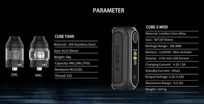OBS Cube-S 80W Box Mod, Akıllı bir yonga seti, 5-80W aralığında kullanılır. Kullanıcıyı ve cihazı korumak için korumalarla yüklü OBS Cube-S 80W Box Mod'u keşfedin. Dayanıklı çinko alaşımı ve deriden üretilen Cube-S Mod'un şasisi lüks ve darbelere oldukça dayanıklıdır, hafif düşmelere ve düşmelere dayanabilir. Dahil olmayan tek bir yüksek amperli 18650 pil ile çalışarak, herhangi bir 510 dişli tanka veya yeniden oluşturulabilir atomizöre 80W'a kadar güç sağlayabilir. Hızlı şarj olan bir USB Type-C Şarj Portu ile donatılmış olan Cube S Mod, 1,5 saat içinde şarj edilebilir.