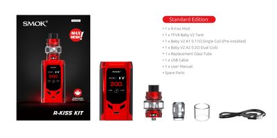 R-Kiss Kit 200W, Genel olarak çift pilli elektronik sigara modelleri arasında şimdiye dek yapılmış en küçük model olma özelliğine sahip SMOK R-Kiss Seti 200W, TFV-Mini V2 Tankı ile eşleşmiştir. 410 gram ağırlığındaki çelik gövde malzemesi ergonamik tasarımı kolay erişilebilir büyük ayar ve ateşleme tuş seti 2ml likit kapasiteli TFV mini Versiyon 2 tankı SmokTech'in en yeni Sub-Ohm tankı ile yüksek lezzet ve buhar üretimi sağlar. Yeni antibakteriyel pamuk ile üretilmiş olan Smok Mini V2 A1 ve A2 yedek bobin başlıkları son derece uzun ömürlü ve likit lezzet sunumu üst düzey coilleri kullanır. Üstten kolay likit dolumu, Hızlı şarj olma özelliği, Geniş dikey ekranı kullanımı kolay menü arayüzü ile Smok R-Kiss Kit, Siyah Kırmızı, Kırmızı Siyah, Gümüş Siyah, Altın Siyah ve Lacivert ve Prizma Krom renk seçenekleri stoktan aynı gün gönderilir.