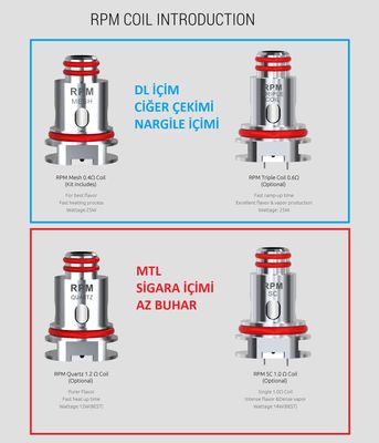 SMOK'un orijinal RPM coil ailesi. Mesh, Triple, Dual Coil, Single Coil ve Quartz yapılarıyla MTL'den DL'e her çekiş stiline uygun 6 farklı direnç seçeneği.