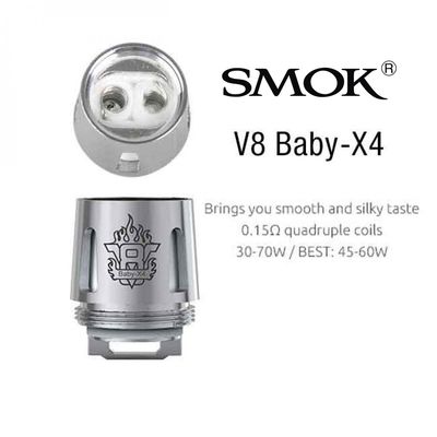 SMOK V8 Baby X4 Coil, Smok Baby Beast Atomizer ve Smok Big Baby Atomizerleri için 0.15ohm beş adet yedek coil içermektedir. Smok X4 coil, saf organik pamuktan yapılmış ve 45-60W arasında değişen bir watt değerinde iki adet tel ve pamuk kullanır. Smok X4 coili manhattan likit ile deneyin ve eşsiz, lezzetli ve tatlı buharın tadını çıkarın!