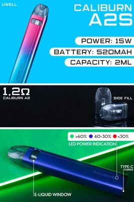 Uwell Caliburn A2S Pod Mod, Entegre 520mAh pil, 2mL yandan doldurulmuş kapsül kapasitesi ve entegre 1.2ohm örgülü bobin içeren Uwell Caliburn A2S Pod Sistemine göz atın. Dayanıklı alüminyum alaşımdan üretilen Caliburn A2S Pod Sisteminin kasası, cepte, çantada veya kitap çantasında kolayca saklanabilen, son derece taşınabilir bir form faktörü sunar. 2 mL'lik bir kapsülle donatılmış Caliburn A2S, silikon tıpalı bir yan doldurma sistemi ile yeniden doldurulur. Berrak bölmenin içinde, en sevdiğiniz likit veya nikotin tuzlarından tat alma tomurcuklarını heyecanlandıracak harika lezzet ve buhar sağlayan entegre bir 1.2ohm bobin bulunur. Çekmeyle etkinleştirilen bir ateşleme mekanizmasıyla çalışan Caliburn A2S, güçlü bir kompakt vape içine yerleştirilmiş bir sonraki en iyi vaping deneyiminizdir.