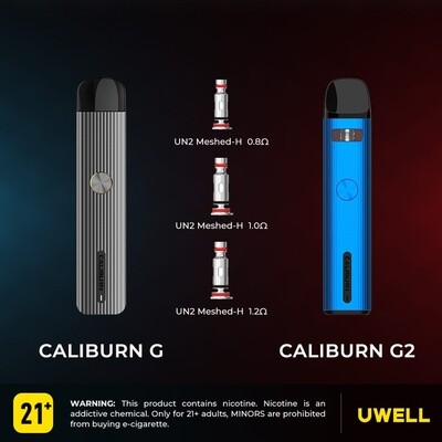 Uwell Caliburn G2 Pod Kit – 750mAh batarya, 18W çıkış ve 2ml pod kapasitesiyle kompakt ve taşınabilir bir cihaz. 0.8Ω ve 1.2Ω coil uyumu, çift ateşleme modu ve ayarlanabilir hava akışıyla MTL içim için ideal, günlük kullanıma uygun bir pod mod kitidir.