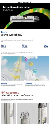 Uwell Caliburn G4 Pod Mod, 1300mAh batarya, 35W çıkış gücü ve HD ekranıyla üstün vaping deneyimi sunar. Storm ve Waves modlarıyla kişiselleştirilmiş kullanım sağlar. G3 ve GPP kartuşlarla uyumludur.
