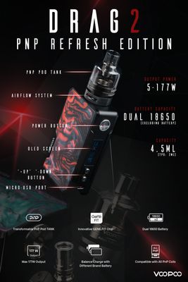 VOOPOO DRAG 2 177W Refresh Edition Kit, İki adet 18650 pil düzenine sahip GENE.FIT Yonga Seti içeren ve yeni PnP Pod Tankı ile birleştirilen VOOPOO DRAG 2 177 Refresh Edition Kitini keşfedin. Dayanıklı çinko alaşımından üretilen Drag 2 Kit'in şasisi, hafif düşme ve düşmelere karşı dayanıklıdır. Gene.FIT Yonga Seti tarafından desteklenen Drag 2 Kiti güçlüdür ve ultra hızlı ateşleme sunar. Ayrıca nikel, titanyum ve paslanmaz çelik tellerle eşleşmeler için kapsamlı bir sıcaklık kontrol paketi sunar. PnP Pod Tankı ile donatılmış VOOPOO Drag 2, görsel olarak çarpıcı bir form faktöründe enfes buhar ve lezzet yaratmak için müjdeli PnP Coil Serisi ile kullanım sunar.