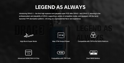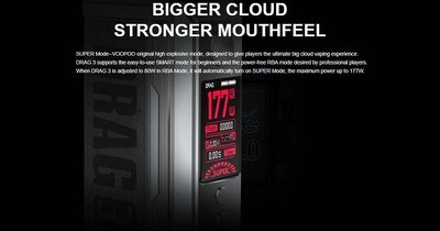 VOOPOO DRAG 3 177W Box Mod, 5-177W çıkış aralığı, gelişmiş GENE.FAN 2.0 Chipset içeren ve güvenilir performans için Süper Mod sunan VOOPOO DRAG 3 177W Kutu Modunu satın alın. Dayanıklı çinko alaşımından üretilen DRAG 3 Box Mod'un kasası güzeldir ve zarif bir form faktörü için deri ve platin renkli metal unsurları bir araya getirir. Bir çift yüksek amperli 18650 pille çalışan DRAG 3 Box Mod, en sevdiğiniz eJuice veya nikotin tuzunun gizli lezzetlerini ortaya çıkaracağınızdan emin olan 177W'a kadar güç çıkışı sağlayabilir. Üstte dişli bir 510 bağlantı ile donatılmış olan DRAG 3, herhangi bir alt ohm tankı veya yeniden oluşturulabilir atomizer ile eşleştirilebilir.