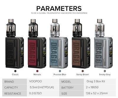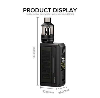 VOOPOO DRAG 3 177W Kit, Gelişmiş GENE.FAN Chipset, 5-177W çıkış ve tatmin edici buhar için bir dizi çalışma modu içeren Voopoo Drag 3 177W Başlangıç Kitini keşfedin. Dayanıklı çinko alaşımından üretilen DRAG 3, efsanevi DRAG soyunun en yeni üyesidir. Kaliteli malzemeleri çinko alaşımı ile harmanlayan DRAG 3 Kit'in görsel olarak çarpıcı yönü, yapabileceği kadar harika görünecek. Çift yüksek amperli 18650 pil yapılandırmasıyla donatılan DRAG 3 Kit, kolaylıkla 177W'a kadar ateşleyebilir. Yeni TPP Pod Tankı ile donatılan değiştirilebilir örgü bobinler, en sevdiğiniz eJuice veya nikotin tuzlarından lezzetli aromalı buhar yaratacaktır.
