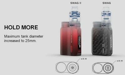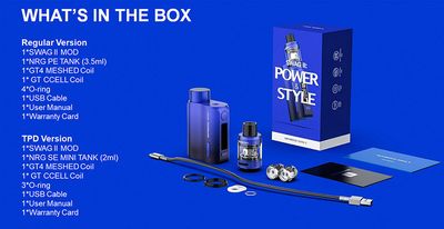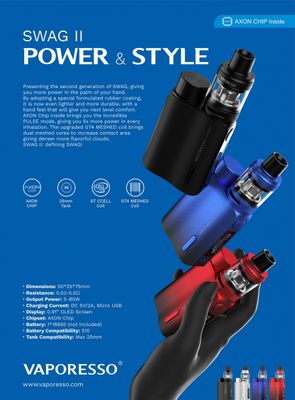 Vaporesso SWAG II 2 80W, Geliştirilmiş bir kasa kaplaması olan yeni AXON Chipset'e yükselten Vaporesso SWAG II 2 80W Starter Kit'i keşfedin. Yeni NRG PE Sub-Ohm Tankı ile eşleştirildi. Çinko alaşımından oluşturulan Vaporesso Swag 2 şasi, geliştirilmiş korumalı bir tasarım sağlarken parmak izlerini ve çizikleri daha kolay ortadan kaldıran kauçuk kaplama ile kaplanmıştır. Bu kavrayıcı kaplama, kutu moduna daha yüksek derecede ergonomik bir his katarak düşme ve düşme olasılıklarını azaltır. Ek olarak, dümendeki AXON Yonga Seti, 80W'a kadar çıkış sağlamak için tek yüksek amperli 18650 pil ile birlikte çalışır. PULSE Modu ile donatılan SWAG 2 Kiti, inhalasyon sırasında daha güçlü bir çıktı sağlayabilir. Vaporesso NRG PE Tankı ile eşleştirilen SWAG II Başlangıç Kiti, Vaporesso GT Coil Serisinden coilleri kullanır. 3.5 mL doldurulabilir meyve suyu kapasitesinin içeriğini buharlaştırmak için kullanılmak üzere sayısız seçenek sunar. Dişli bir üst doldurma sistemine sahip olan NRG PE Tank, aynı zamanda, birlikte verilen 0.15ohm GT4 Meshed Coil ile birlikte kullanılmak üzere çift oluklu alt hava akışı kontrol halkası ile donatılmıştır Ve 0.5ohm GT CCELL coili, tatmin edici buhar bulutları oluşturur.