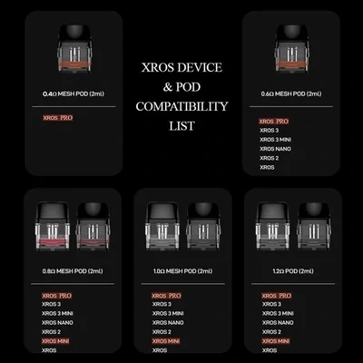 0.4Ω kartuş sadece XROS Pro, Pro 2, XROS 4/4 Mini/4 Nano ve XROS 5/5 Mini/5 Nano ile uyumludur. Diğer tüm dirençler tüm XROS ailesiyle uyumludur.